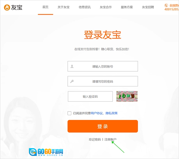 接下来选择【注册账户】来创建账号。需要留意的是,这个账号主要是用于购买智能售货机设备或者参与加盟合作,一般要在完成设备采购或加盟流程之后,才能通过后台开通友宝友客云的使用权限。