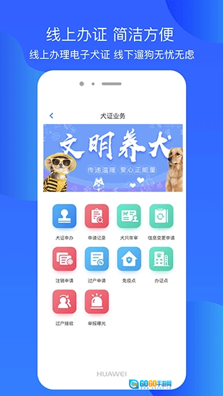 1、倡导文明养犬新方式——既支持在线申办犬证,又能便捷查询周边免疫服务点;