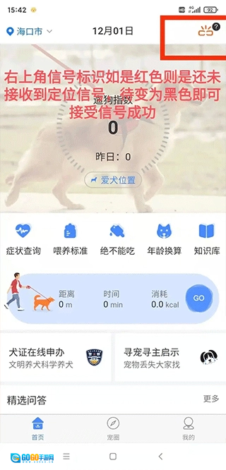 充电结束后,请把犬牌拿到室外(室内收不到卫星信号),或者让狗狗戴上它出去活动一会儿,这样就能完成首次定位校准。等连接成功了,App首页右上角的红色图标就会变成黑色。