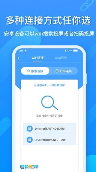 自动搜索连接功能:可实现手机屏幕向电视投影,当设备处于同一WiFi网络环境下时,系统会自动搜索并成功连接相应设备。