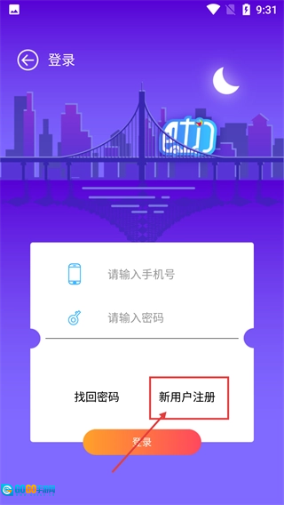 进入登录页面时,需要填写“请输入手机号”和“请输入密码”对应的内容,之后点击“新用户注册”按钮。