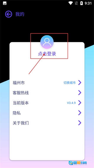 点击头像后会进入【我的】页面,该页面设有【点击登录】按钮,同时还能看到【福州市】-切换城市、【客服热线】等功能选项。