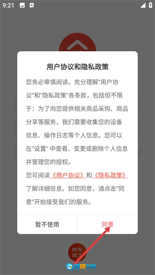 在用户协议与隐私政策的弹窗里,仔细阅读《用户协议》和《隐私政策》的内容后,点击【同意】按钮,即可进入登录界面。