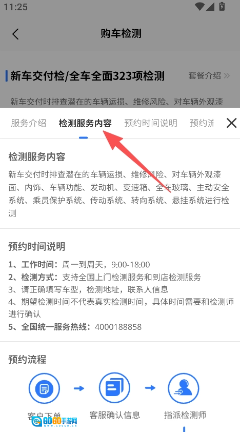 服务透明详尽,检测项目、时间说明、流程等均有详细展示,即便购车新手也能清晰了解检测全貌,体验良好。