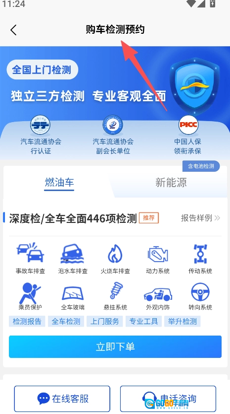 具备检测类型选择功能,支持深度检、新车交付检等多种检测项目的选择,方便用户根据自身购车需求,针对性地预约检测。