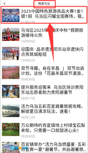3、回到应用首页后,点击“畅游乌当”板块,即可进入本地旅游资讯列表页面。
