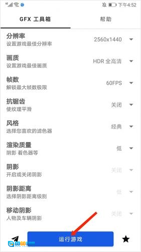 6、最后我们选择【运行游戏】选项,即可开始不一样的游戏画质体验了,以上就是gfx工具箱的用法了。