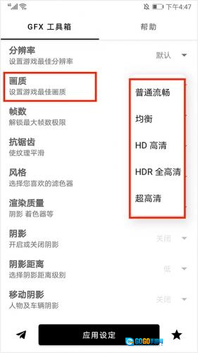 4、可看到包括普通流畅、均衡、HD高清、HDR全高清和超高清选项,越往下说明效果越好,用户可根据手机配置情况自行选择,