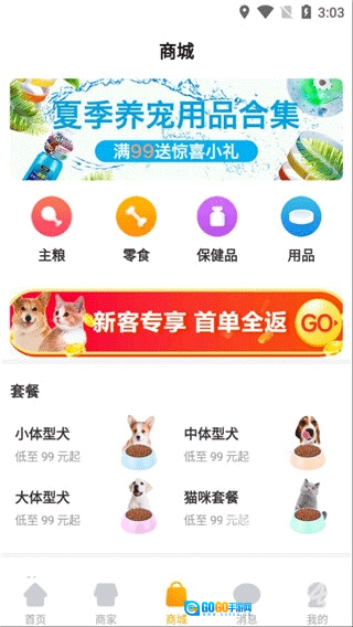 3. 为购物中心供应商品,商城提供高性价比的猫粮、狗粮、宠物玩具、日常护理用品、保健产品以及宠物套餐等。
