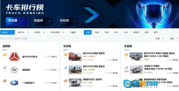 6、排行榜:轻松了解高人气的热门车型;涵盖热门轻卡、热门牵引车、热门载货车自卸车以及热门新能源车等各类排行榜。