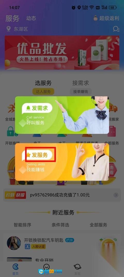 2、点击后会弹出发需求和发服务的选择板块,选择发服务;