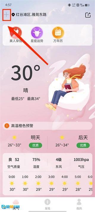 1、在本站安装美人天气应用,打开后点击左上角的+号来添加地点