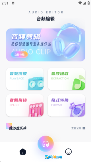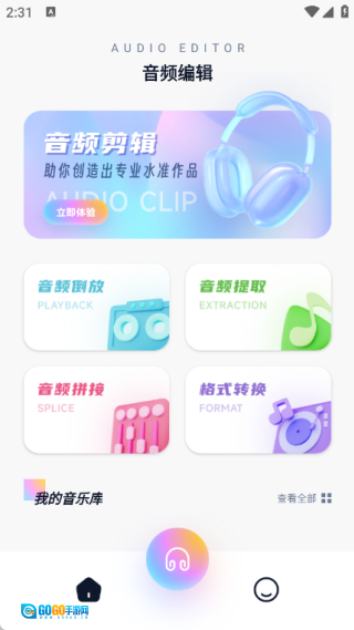 首页集成了音频剪辑、音频倒放、音频提取、音频拼接、格式转换等实用功能。