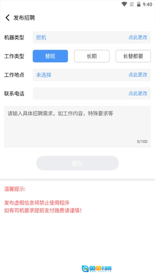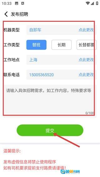 在发布招聘页面,依次填写机器类型、工作类型、工作地点、联系电话以及招聘需求等相关信息后,点击【提交】按钮即可。