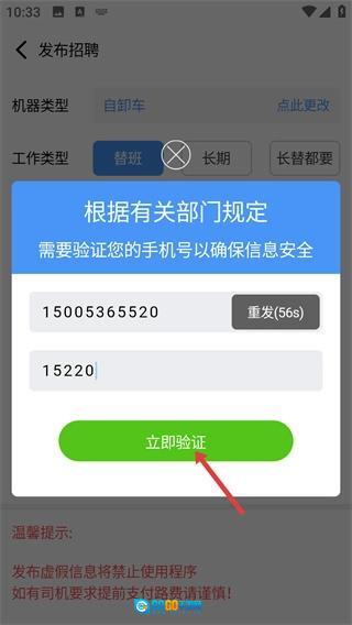 在手机号验证弹窗里输入验证码,接着点击【立即验证】按钮,这样就能完成招聘发布的操作了。