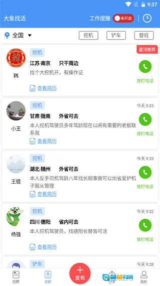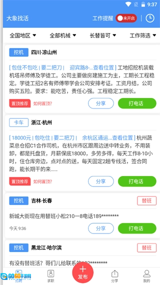 覆盖各类工程机械,机主可自行发布作业信息,司机能精准对接替班或长期工作,双向满足招工与求职需求,服务场景全方位适配。