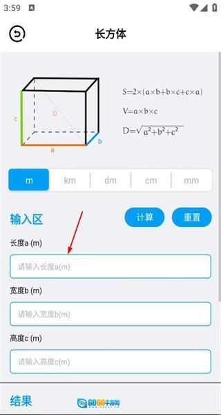 3、进入长方体计算页面后,页面会展示对应的几何公式。在选定单位后,填写长a、宽b和高c的数值,然后点击计算按钮,即可获取相关的几何量结果。