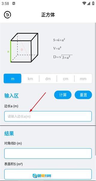 2、进入正方体计算页面后,页面会展示表面积、体积等相关公式。选择好单位后,在输入区域填写正方体的边长,点击计算按钮即可获取对应的计算结果。