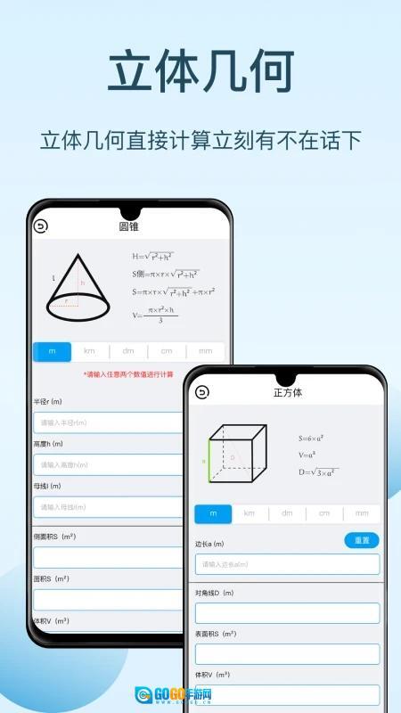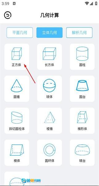 打开软件后,进入立体几何界面,这里会呈现正方体、长方体等图形选项,选择正方体选项即可进入其专属的计算页面。