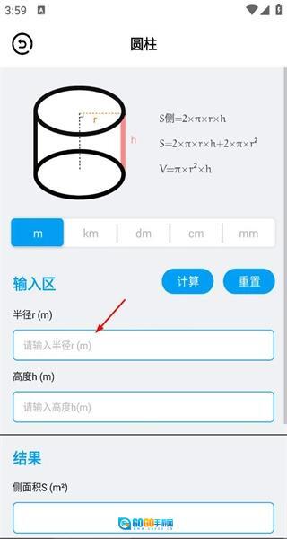 4、进入圆柱计算页面,这里会展示侧面积等相关公式。先选择好单位,再填写半径和高度的数值,最后点击计算按钮,就能获取对应的几何计算结果。