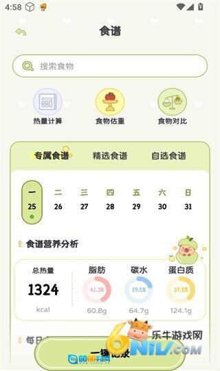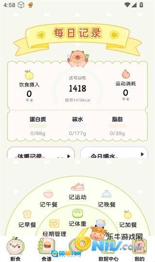 3、食谱页面可助你记录日常饮食状况,同时还能估算出相应的热量摄入量。
