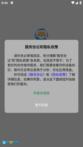 软件安装完成后启动,会弹出服务协议与隐私政策的确认窗口,此时点击“同意”按钮即可。