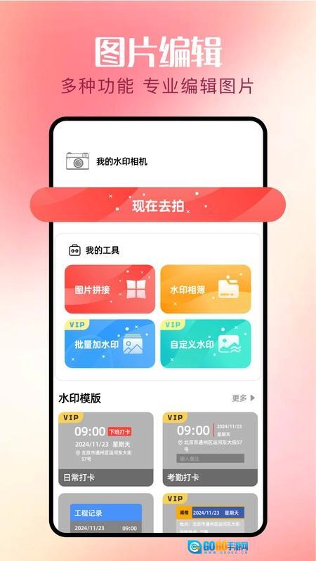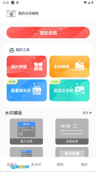 在自定义功能板块,包含了图片拼接、水印相簿、批量加水印以及自定义水印这些功能。
