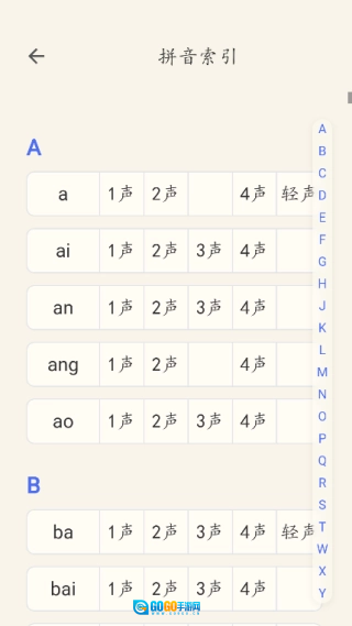 在主页面点击“拼音索引”,就能按照拼音来进行查询。