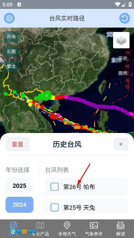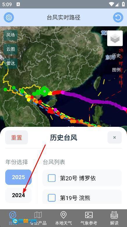 2、切换数据视图:在台风详情页面找到“视图切换”按钮,根据需求可以切换到卫星云图、风场图或者雷达图,也能够在普通地图和卫星云图模式之间进行切换,从而更深入地了解台风的具体状况。