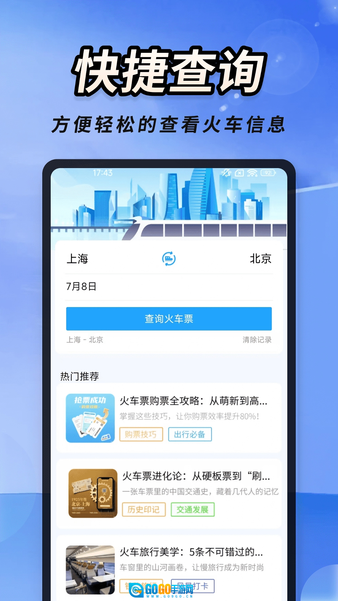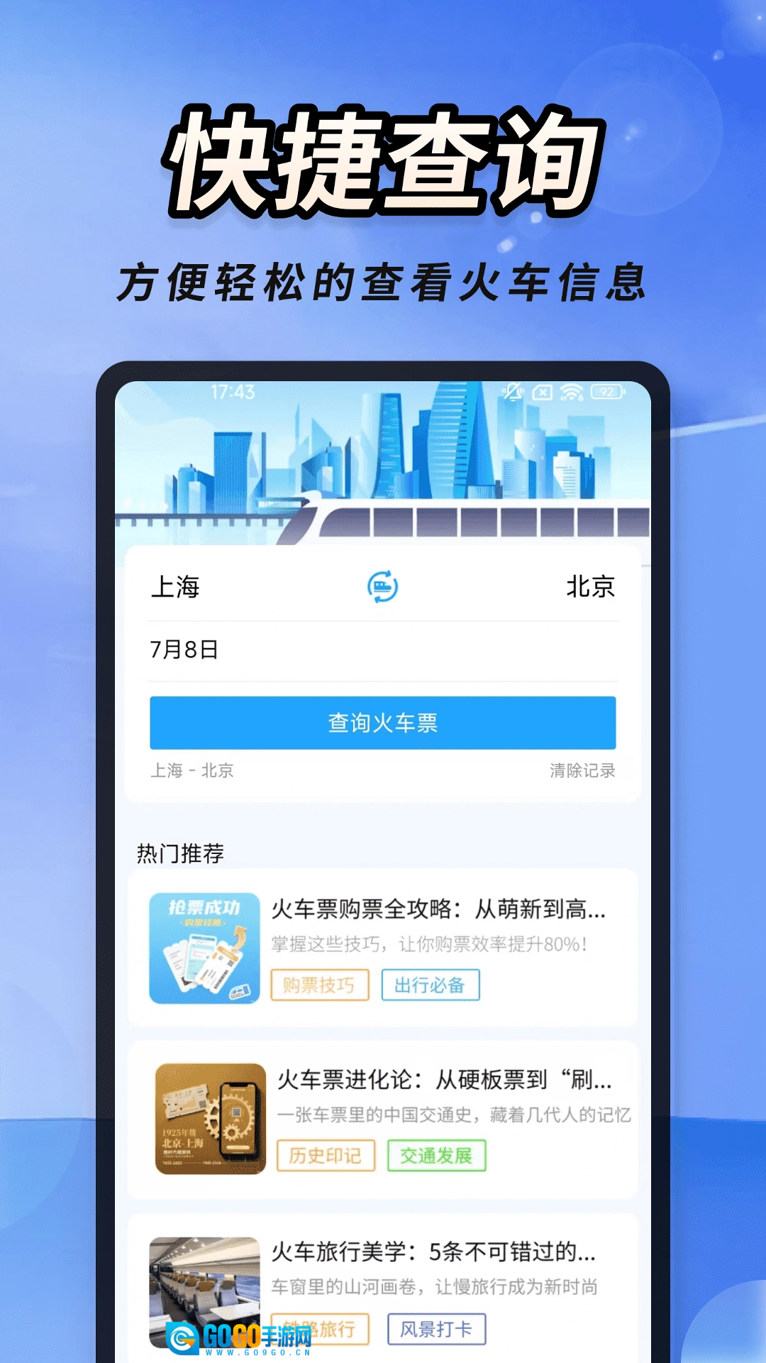 在首页选择出发地与到达地,接着选定时间查询火车票,此外还有各类热门推荐的文章。