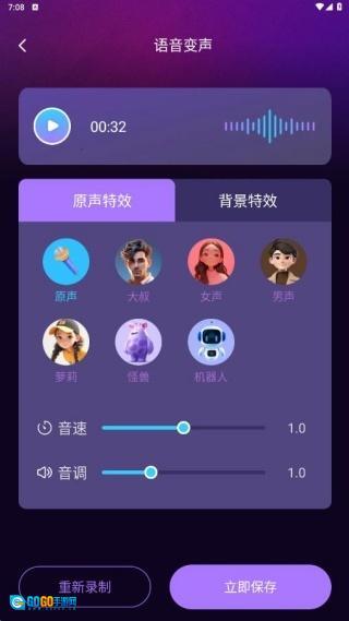4、进入变声界面,可对原声和背景特效进行自定义设置,选好后点击立即保存,就能生成专属于你的录音变声素材。