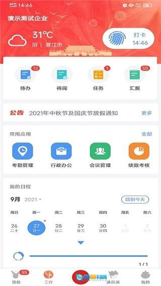 工作日程的功能在于把每日的各项工作与事务都对应安排到具体日期中,并且做好高效的记录,以此来助力日常工作与事务的管理,从而达成工作备忘的效果。此外,它还能与门户内的流程中心、会议管理、人力资源等系统完成对接,使得相关信息可以自动转化为日程安排。与此同时,该功能也具备对员工日常工作开展指导和监督的作用。