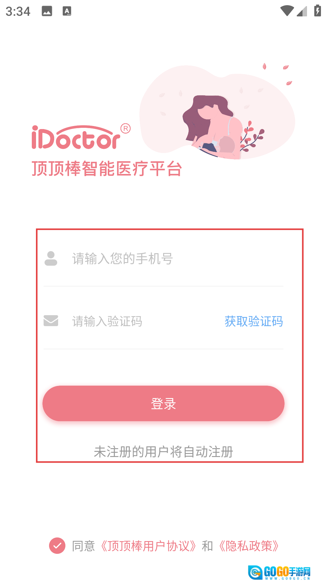 3、输入【手机号码】,点击【获取验证码】按钮,待收到短信验证码后将其输入,再点击【登录】按钮,就能进入顶顶棒智能医疗平台了。