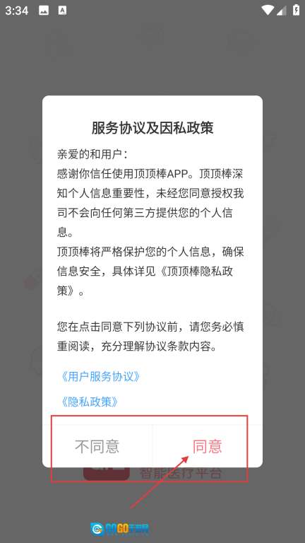 1、启动时会弹出服务协议与隐私政策的说明界面,点击【同意】按钮即可进入后续界面。
