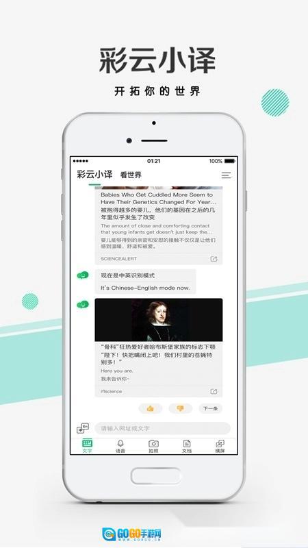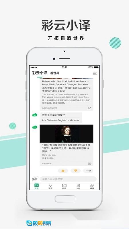 彩云小译是由北京彩彻区明科技有限公司开发的手机翻译应用软件,具备中日英同声传译、文档翻译以及网页翻译等功能。它能够帮助用户在工作、出国旅游、与外国友人聚会等不同场合解决语言沟通上的障碍;同时还拥有输入任意网址即可浏览中英对照网页的实用功能。