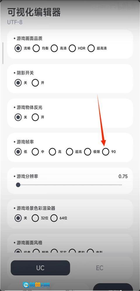 3、进入可视化编辑器还可以对游戏的帧率进行修改,比如解锁90高帧率