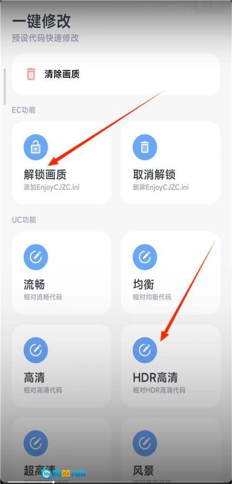 2、然后进入修改界面,点击解锁画质,然后选择画面清晰度,有流畅、高清、均衡等几种提供选择