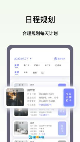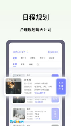 日程打卡助手除了能制定日程,还具备日程管理功能。用户可按工作、学习、娱乐等不同标签对日程分类,方便查找与整理;也能设置优先级,保证重要事项及时处理。它的一大特色是日程打卡功能——用户完成任务或参加活动后,可通过应用打卡记录完成情况,借此清晰掌握工作进度和每日任务完成状态。此外,打卡统计功能可助力用户分析时间分配,找出时间浪费之处,进而优化时间管理。