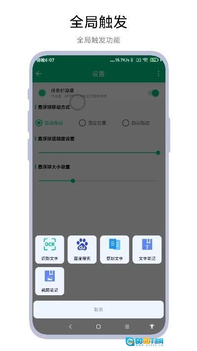 怎样提取手机屏幕上显示的文字呢?智能识屏作为一款专业度很高的文字识别工具,具备文字快速识别的能力,能让用户毫不费力地提取屏幕文字。它还支持个性化设置,用户可自主调整悬浮球的尺寸、移动模式以及透明度,也能自行添加并绑定百度搜索、文字翻译、屏幕截图等实用功能,全方位满足你的各类使用需求。