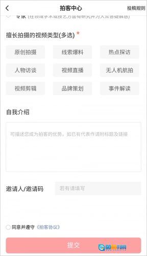 3、最后填写个人所在地、擅长视频类型等基础信息,点击完成按钮,即可完成拍客入驻流程。
