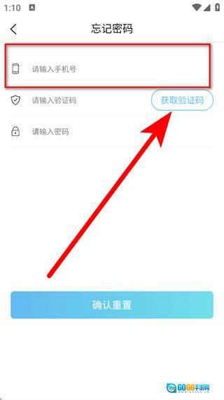 3、进入忘记密码页面后,输入手机号码,接着点击获取验证码按钮。