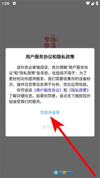 1、启动专课专练教师端应用,当出现隐私政策弹窗时,点击“同意并接受”按钮。