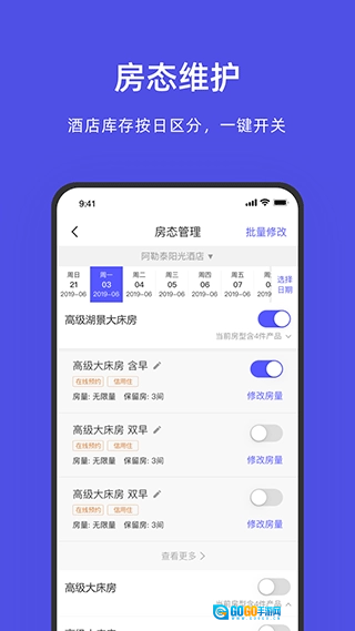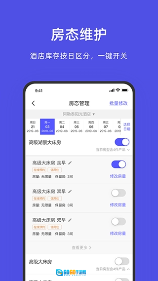 房态维护:对房间状态进行实时更新,防止出现超售情况,可一键切换房间的预订状态。