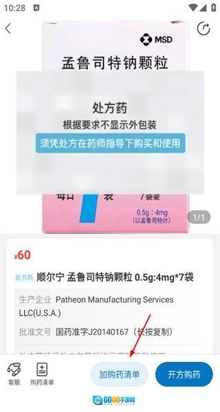 4、进入顺尔宁颗粒的详情页面,页面会展示该药品属于处方药以及其价格和生产企业的信息,点击“加购药清单”按钮,即可将该药品添加到清单中。