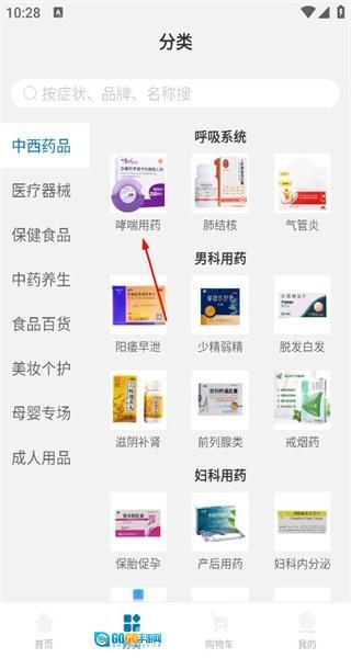 1、启动软件后,进入分类界面,中西药品类别包含呼吸系统分类,该分类下设有哮喘用药选项,点击此选项即可进入对应的药品列表页面。