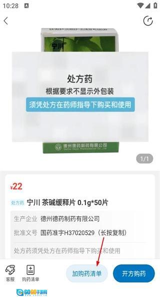 3、进入宁川茶碱缓释片的详情页面后,页面会显示该药品属于处方药,同时展示其价格和生产企业信息。接着点击“加购药清单”按钮,即可将此药品添加到清单中。