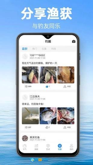 用户还能分享学习方法与钓鱼工具,也可以查询钓鱼地点的天气情况。
