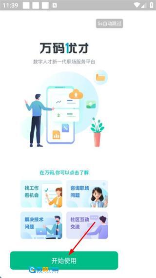 1、在万码优才的引导页面,点击“开始使用”按钮,即可进入手机号登录注册界面。