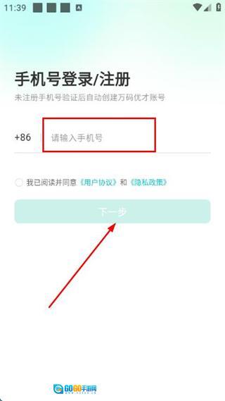 2、进入手机号登录注册页面后,先填写手机号,接着勾选相关协议,再点击“下一步”按钮。