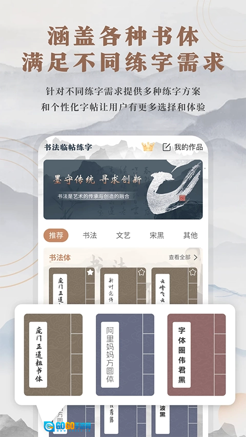 整合了海量历代名家书法碑帖与字库资源,涵盖颜真卿、王羲之等大家的经典作品,支持放大缩小功能与临摹练习。